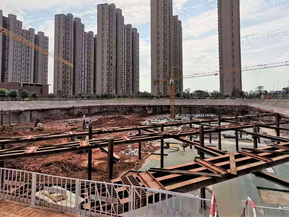 該項目位于武漢市洪山區(qū)青菱新區(qū),地下設兩層地下室,基坑開挖面積14600㎡,基坑周長476m,基坑開挖深度9.8m—13.6m。在項目方案設計階段,設計中心技術團隊經充分討論后決定大膽創(chuàng)新,采用型鋼組合支撐的綠色新工藝,該工藝是武漢市兩層地下室基坑工程中的首次成功應用。