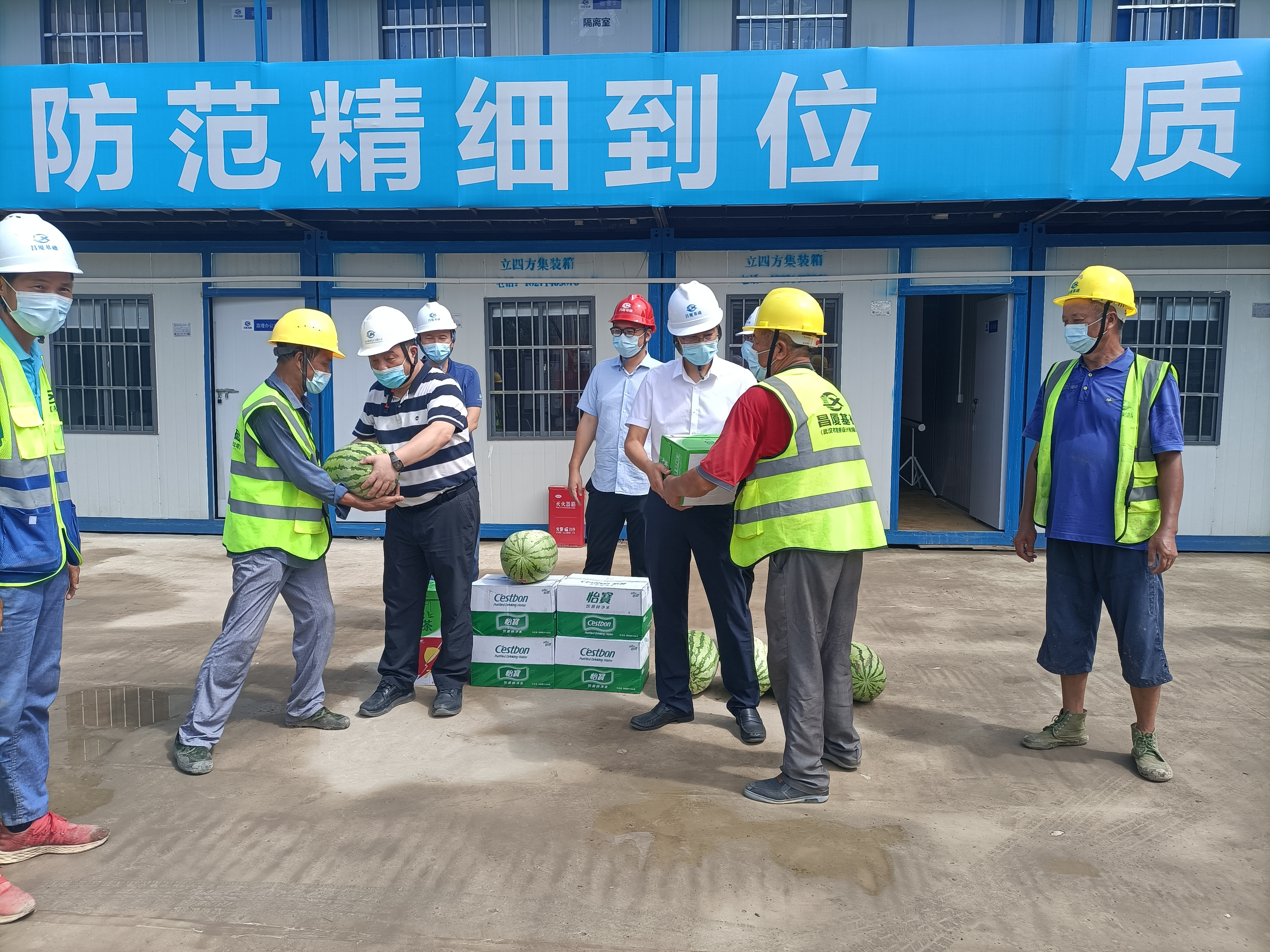 同時,公司領(lǐng)導(dǎo)在項目現(xiàn)場開展了送清涼活動,為一線人員送上礦泉水、西瓜、花露水、藿香正氣水等防暑降溫物資及個人防護(hù)用品,并叮囑在高溫堅守崗位的一線職工要注意勞逸結(jié)合,做好疫情個人防護(hù),消除各類安全隱患,確保夏季安全生產(chǎn)。(綜合部(黨群工作部)