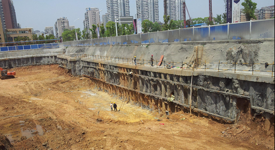 工程特點(diǎn):項(xiàng)目位于武昌區(qū)武珞路老武鍋內(nèi),設(shè)置二層滿鋪地下室,開(kāi)挖深度9.70m~15.50m,周長(zhǎng)380m,面積8500m2。