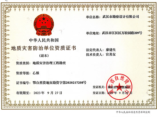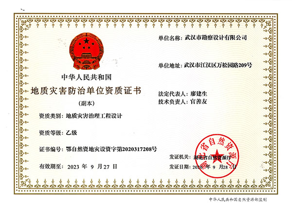 2020年9月28日,公司地質(zhì)災(zāi)害危險(xiǎn)性評(píng)估、勘查、設(shè)計(jì)丙級(jí)升乙級(jí)資質(zhì)申報(bào)材料順利通過(guò)湖北省自然資源廳審核,并取得了地質(zhì)災(zāi)害危險(xiǎn)性評(píng)估、地質(zhì)災(zāi)害治理工程勘查、地質(zhì)災(zāi)害治理工程設(shè)計(jì)乙級(jí)資質(zhì)證書(shū),為公司今后能夠順利承接各類中小型地質(zhì)災(zāi)害危險(xiǎn)性評(píng)估、勘查、設(shè)計(jì)業(yè)務(wù)等提供了更有力的保障。