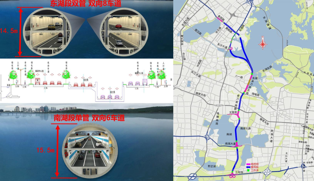為更好地支撐城市空間發(fā)展,武漢市“十三五”規(guī)劃中要求“加大地下空間開發(fā)利用度,加強地下通道、地下停車場等地下交通設(shè)施建設(shè),啟動實施‘負高架’工程,改善交通出行條件”。兩湖隧道作為世界上規(guī)模最大的城市湖底雙層超大直徑隧道,是武漢市重點市政工程,也是惠及武漢千家萬戶的重大民生工程。項目建成后,將在武昌片區(qū)形成一條南北向快速通道,可有效緩解二環(huán)線、珞獅南路、水果湖隧道等道路交通壓力,不斷完善區(qū)域路網(wǎng)體系,方便周邊地區(qū)居民出行。
