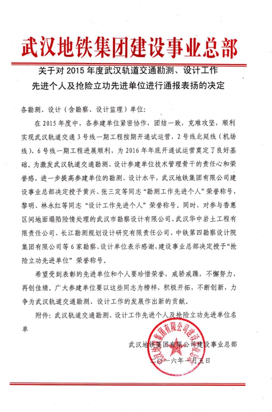 鑒于我公司在武漢市軌道交通3號(hào)線香惠區(qū)間地面塌陷搶險(xiǎn)工作中的突出表現(xiàn),武漢地鐵集團(tuán)有限公司建設(shè)事業(yè)總部授予我公司等6家勘察、設(shè)計(jì)單位“搶險(xiǎn)立功先進(jìn)單位”榮譽(yù)稱號(hào)。其中我公司在各單位中排在第一位。為激發(fā)武漢交通勘測、設(shè)計(jì)單位技術(shù)管理骨干的責(zé)任心和榮譽(yù)感,授予我公司羅坤、彭華中2位同志武漢軌道交通“勘測先進(jìn)個(gè)人”。(巖土一公司)