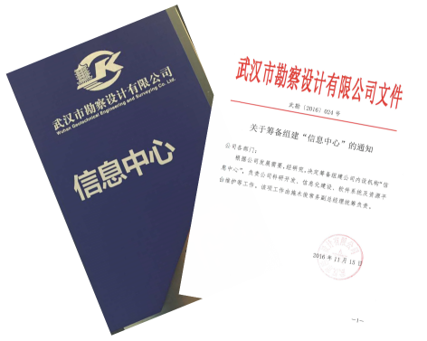 2017年1月1日,武漢市勘察設(shè)計有限公司正式下文成立信息中心,主要負(fù)責(zé)公司科研開發(fā)、信息化建設(shè)、軟件系統(tǒng)及資源平臺維護(hù)等工作。