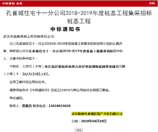 2018年4月19日,我司經(jīng)過多輪競爭報價,成功中標孔雀城住宅十一分公司2018-2019年度樁基工程集采招標樁基工程,中標價為3.57億元。